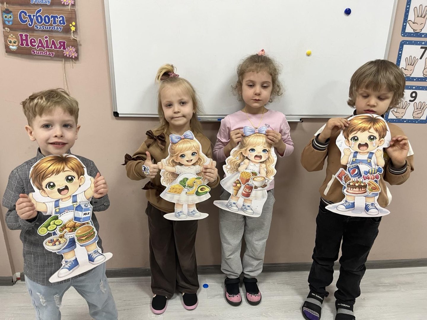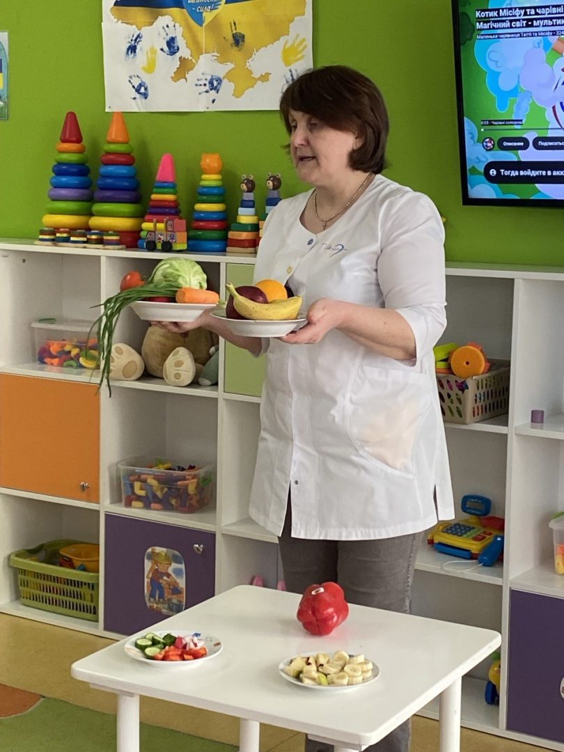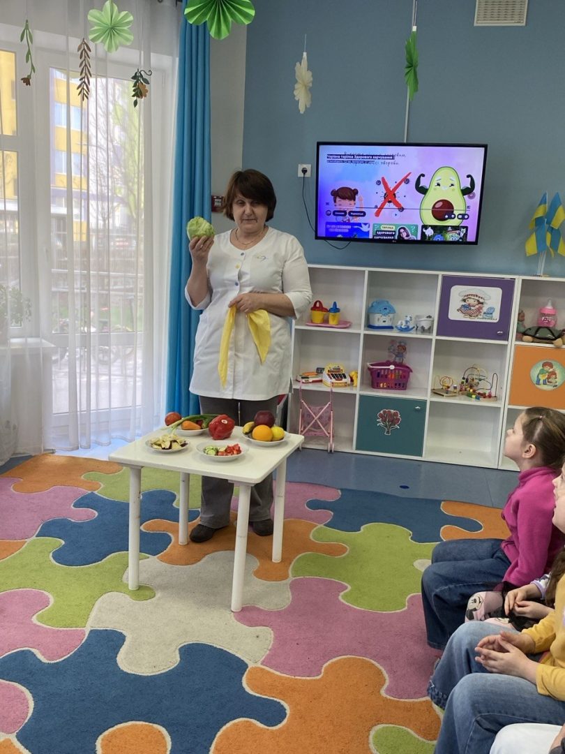 Під час зустрічі діти дізналися про важливість збалансованого раціону, користь овочів, фруктів, злаків та інших продуктів для здоров’я і гарного самопочуття. Малята із задоволенням обговорювали, які страви є корисними, а які варто вживати рідше.