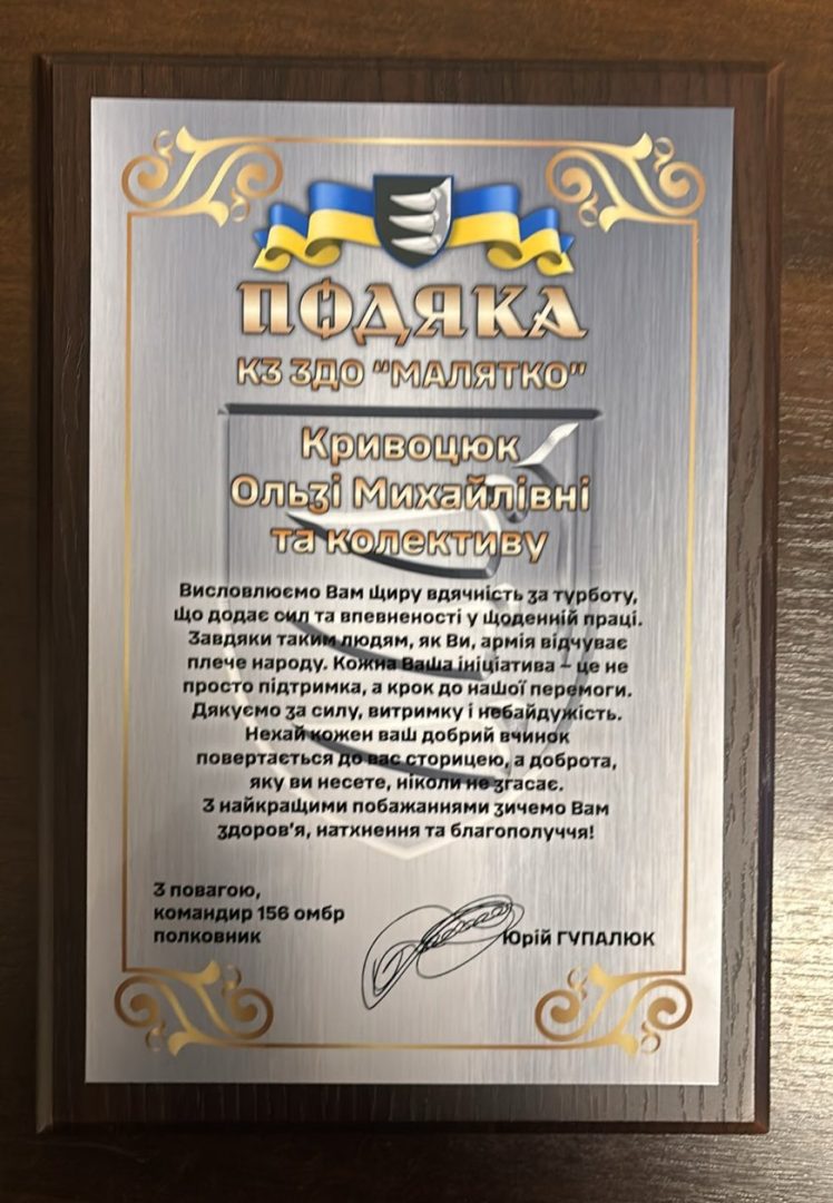Колектив КЗЗДО “Малятко” отримав подяку від військовослужбовців Збройних Сил України за підтримку, небайдужість та активну громадянську позицію.