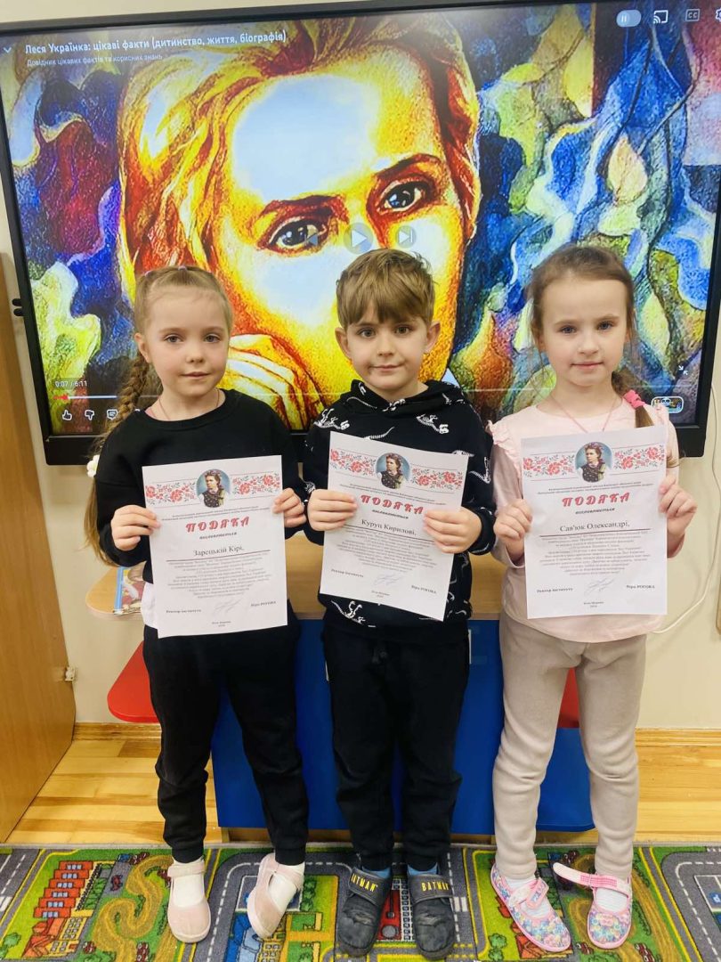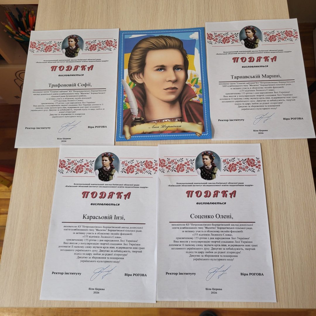 Діти старшого віку ЗДО «Малятко» отримали подяки від Київського обласного інституту післядипломної освіти педагогічних кадрів за читання віршів Лесі Українки. Даний челендж був присвячений 155-річчю з дня народження письменниці та проходив під назвою «155 відтінків Лесиного Слова». Пишаємся нашими малятами!