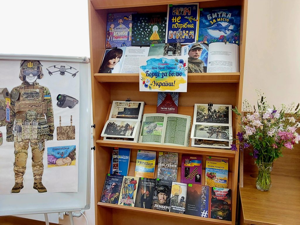 Працівники бібліотеки підготували тематичну виставку “Борці за волю України”, яку учні з цікавістю розглядали. Тут і фото захисників, документальні описи подій, історичні довідки, художні твори.