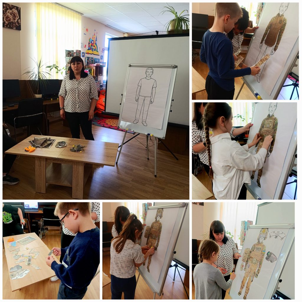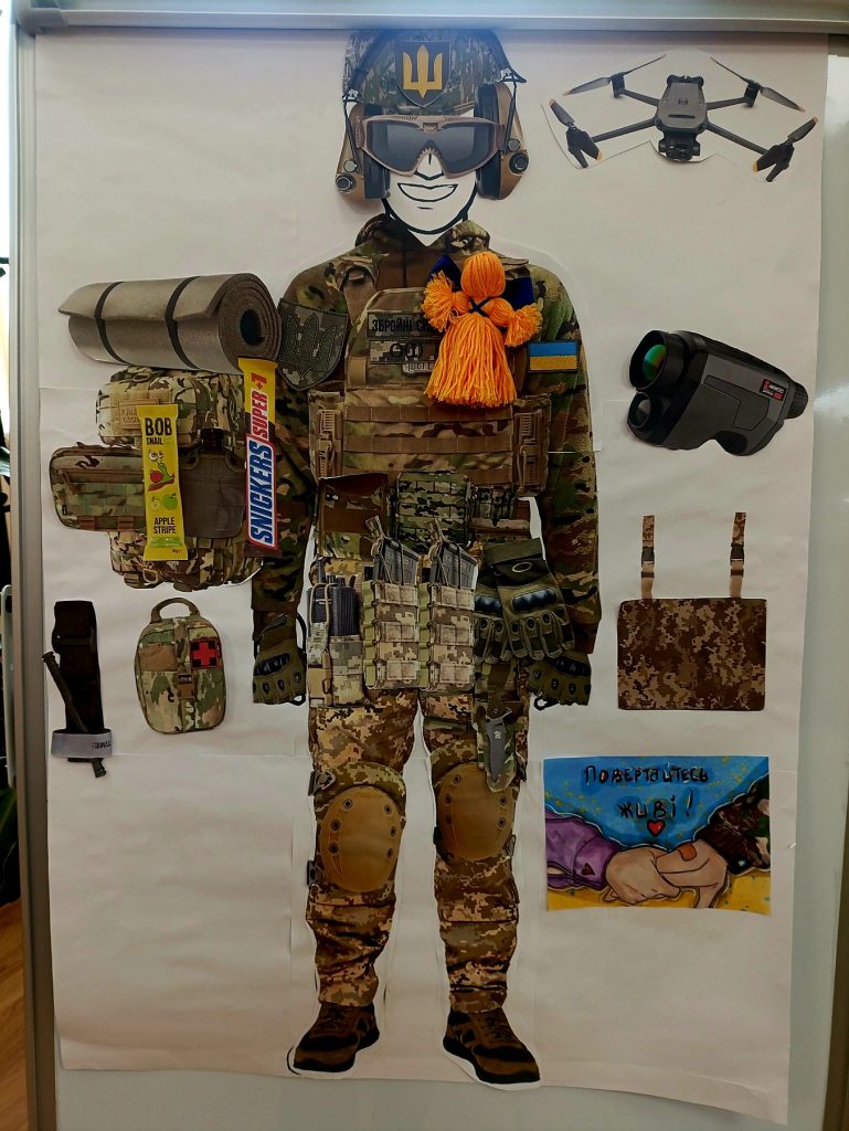 А ще — провели інтерактивну гру: школярі по черзі “одягали” шаблон українського воїна — шолом, бронежилет, захисні рукавиці, окуляри, а також додавали допоміжні речі: аптечку, воду,турнікет, дрон, рюкзак, каремат, тепловізор, солодощі. Усе те, що допомагає нашим захисникам вижити. У процесі говорили, для чого потрібен кожен елемент. Діти виявили велику обізнаність, щирий інтерес і глибоку повагу.